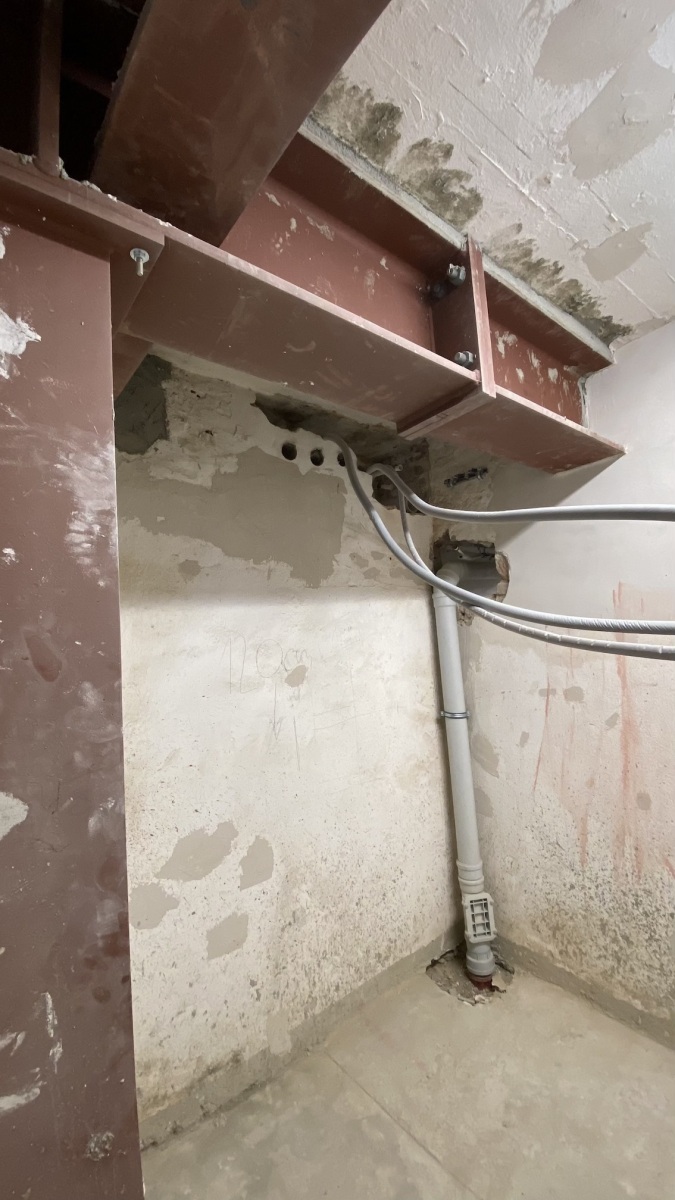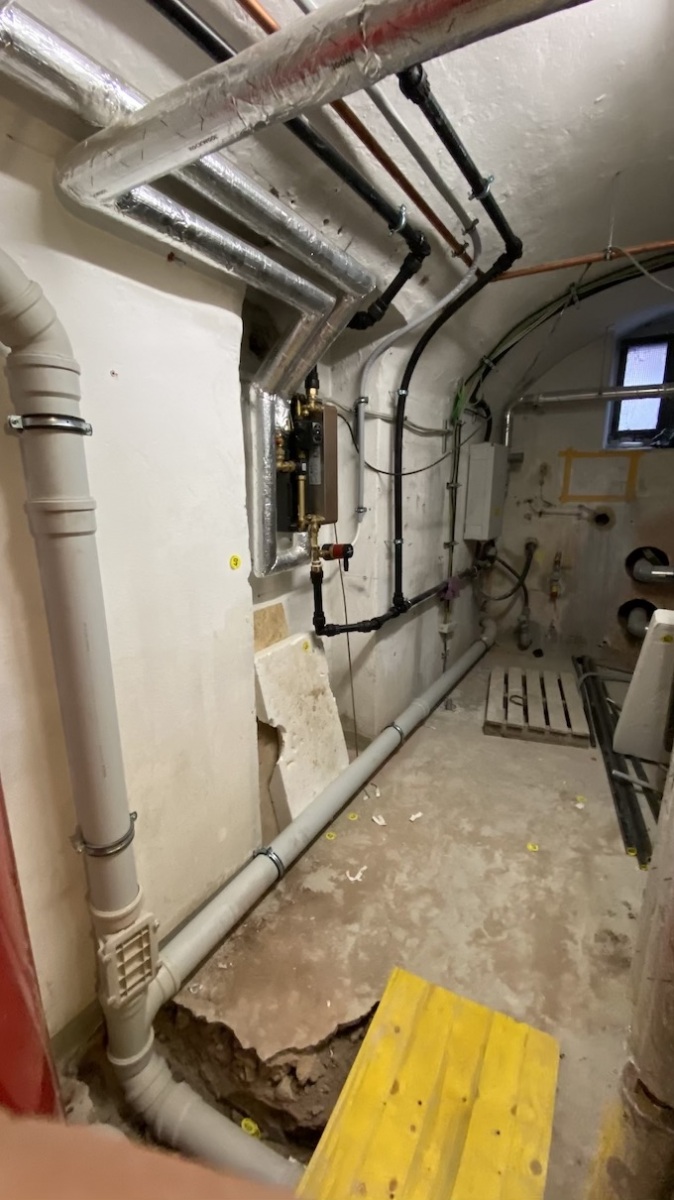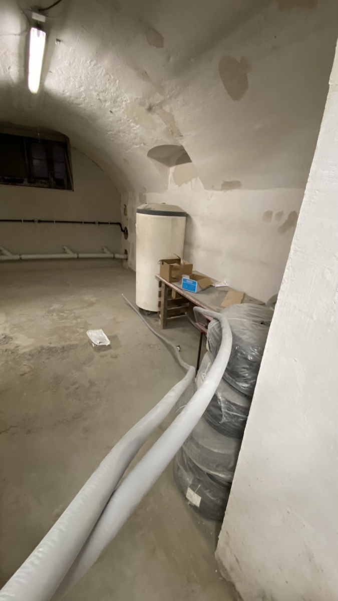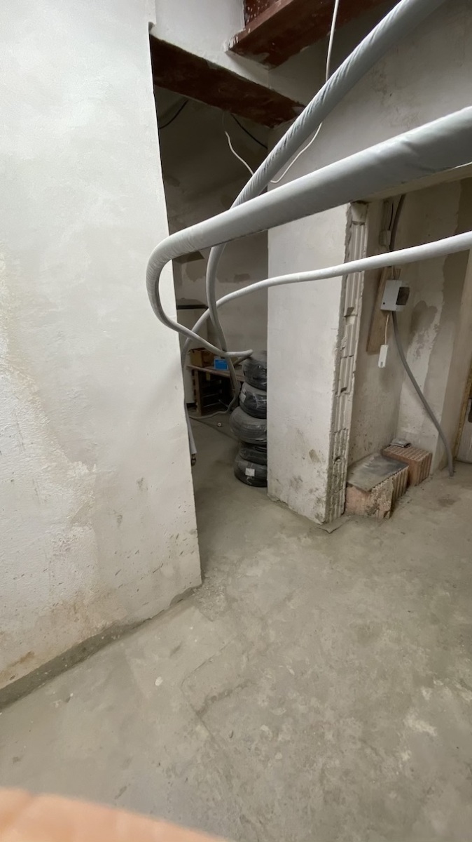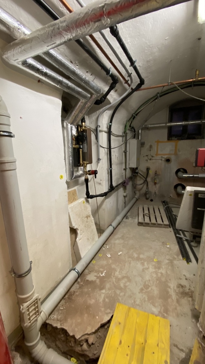 Die Entwässerungsleitungen im Kellergeschoss für die Waschmaschinen in den Bewohnerkellern wurde verlegt, der Keller ausgeräumt