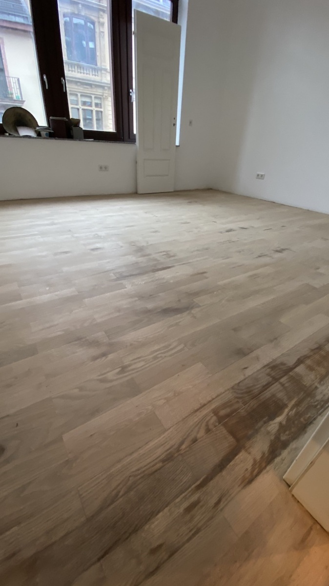 Das eindrucksvolle Bild von Mahdi zeigt das Parkett der Wohnung 6, welches ebenfalls unsaubere Schleifergebnisse nach dem Ölen aufgezeigt hat. Es wurde bereits nachgeschliffen (dies sieht man eben auf dem Bild) und nun muss nachgeölt werden.